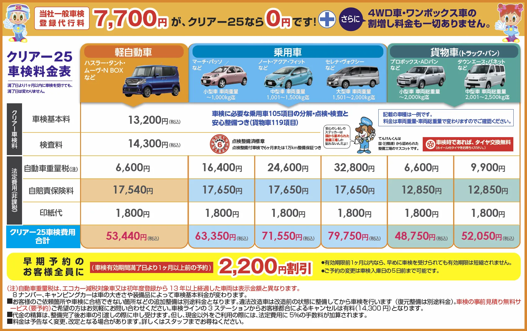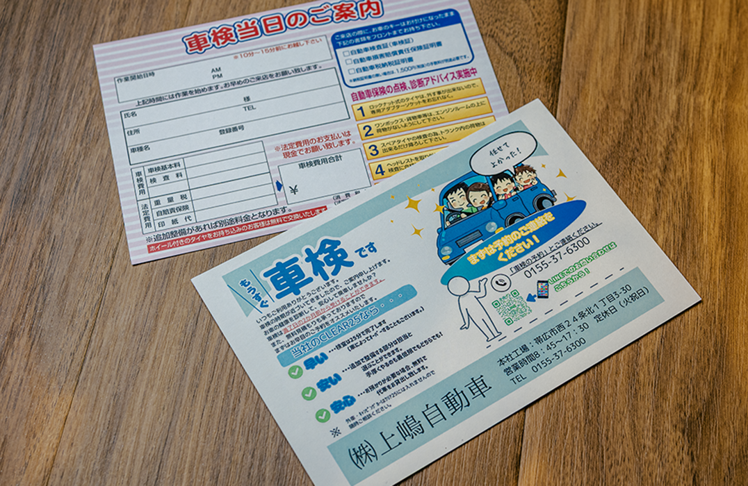予約受付後、車検ガイドハガキを送付いたします。車検入庫日時・概算見積金額・持参書類など記載してあります。