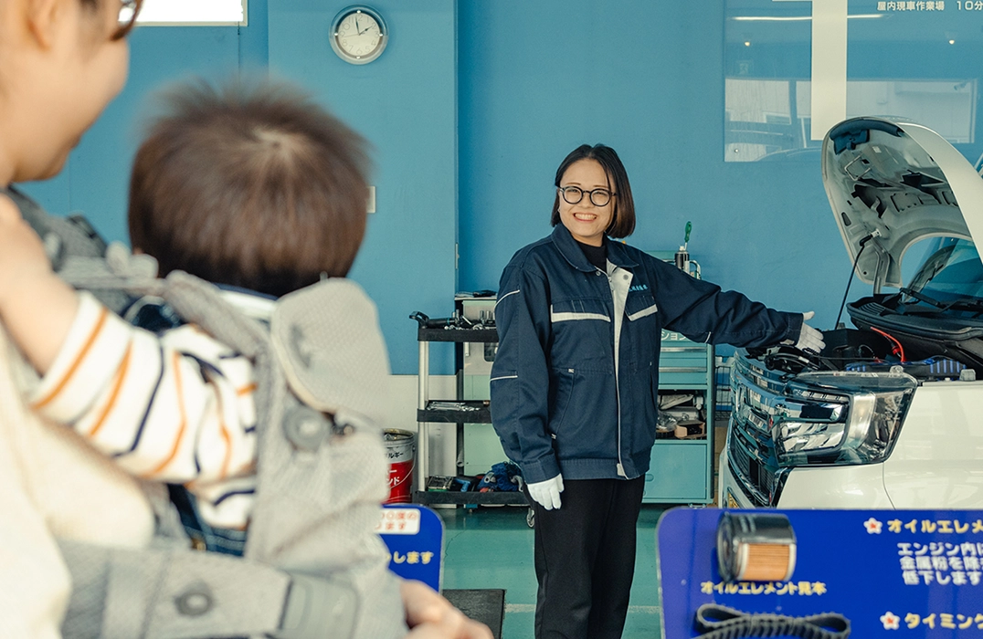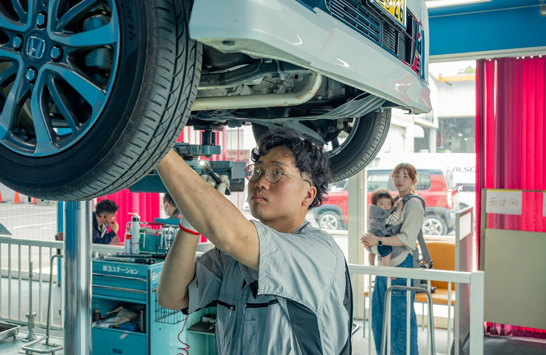 検査ラインで行なう車検作業の全てを見学コースでご覧いただきます。検査の結果は診断カルテで説明いたします。